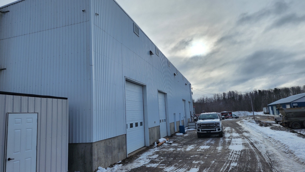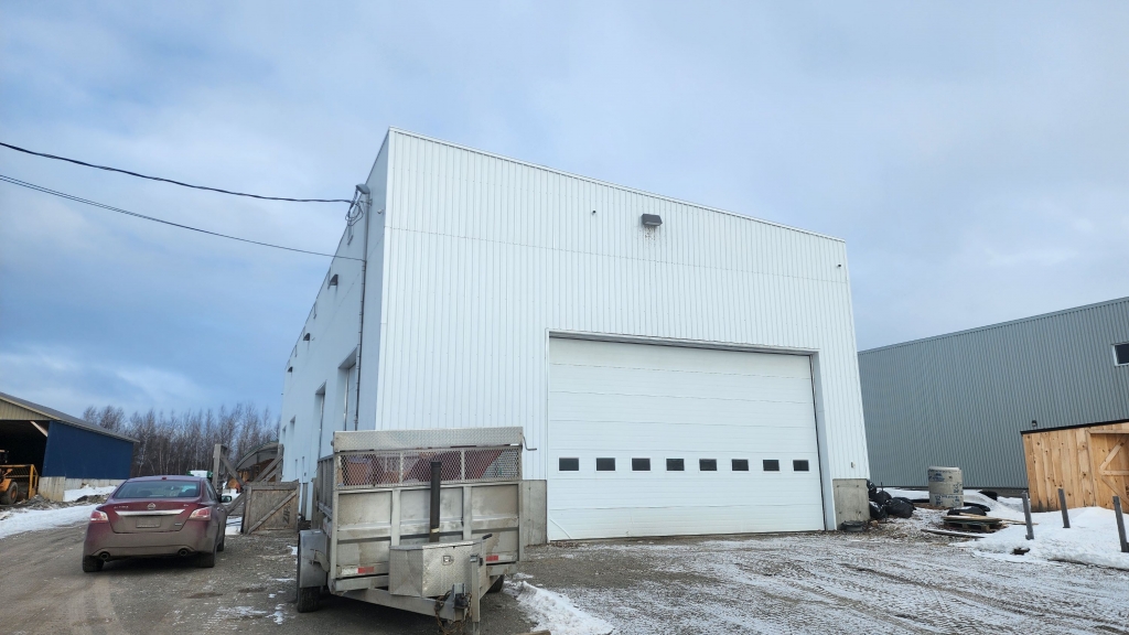 Très beau local industriel 120’ x 40’ avec 5 portes de garage. Chauffé au chauffage aux granulés de bois, éco-énergétique.