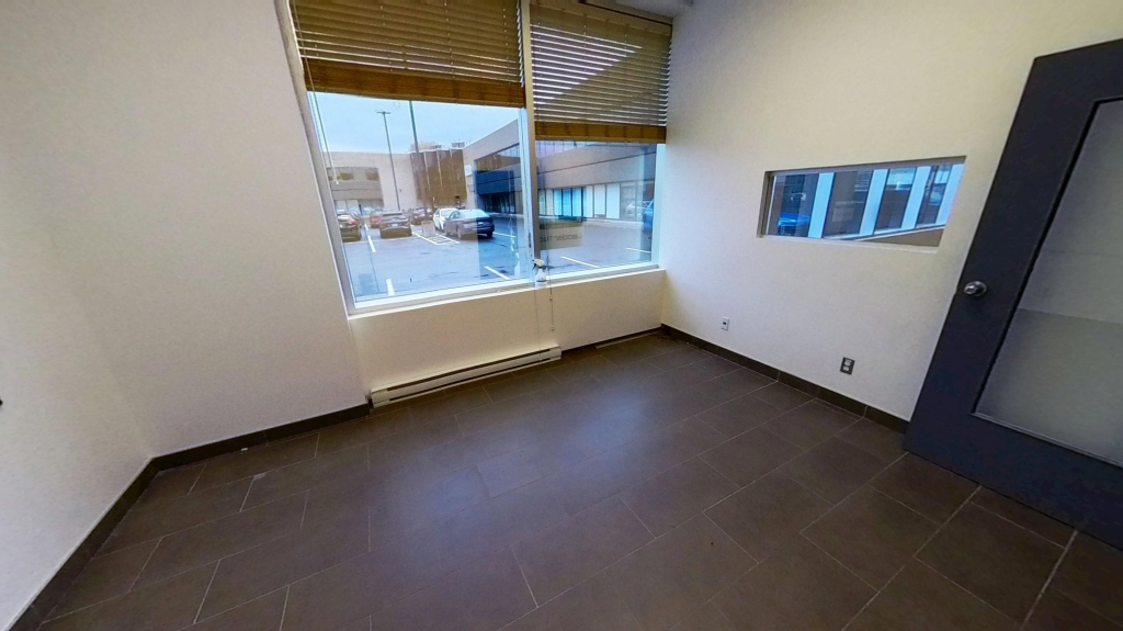 L’entrée du local s’ouvre sur une aire d’accueil moderne, suivie d’un bureau fermé lumineux donnant sur l’extérieur. L’espace central est composé de plusieurs sections cloisonnées pouvant être adaptées selon les besoins du futur locataire. À l’arrière, un espace entrepôt avec porte de garage au sol facilite le transport et la réception de matériel.