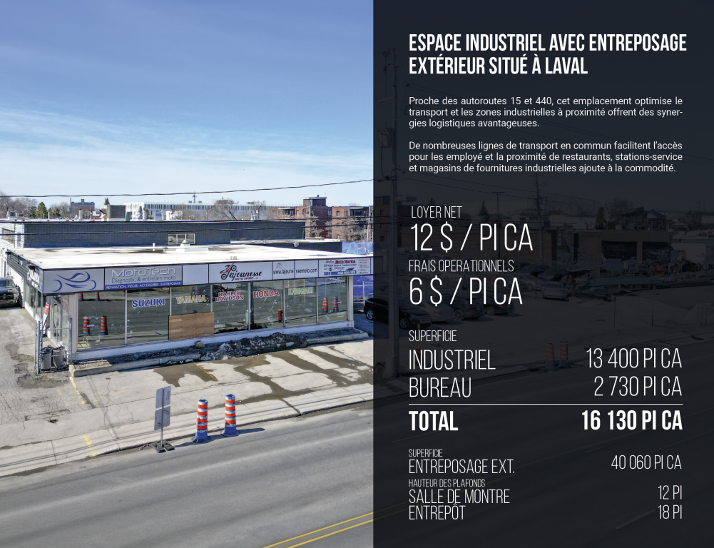 Proche des autoroutes 15 et 440, cet emplacement optimise le transport et les zones industrielles à proximité offrent des synergies logistiques avantageuses. De nombreuses lignes de transport en commun facilitent l’accès pour les employé et la proximité de restaurants, stations-service et magasins de fournitures industrielles ajoute à la commodité.